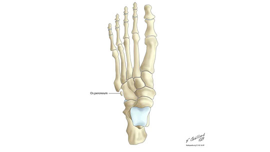 The Os Peroneum is an extra small piece of cartilage or bone that is located in the peroneus longus tendon (the tendon that is located on the outside of the lower leg and ankle). Two sections start together at the upper portion of the lower leg, travel down the lengh of the lower leg and wrap around the ankle bone. Os Peroneum is very common (up to 26% of feet).