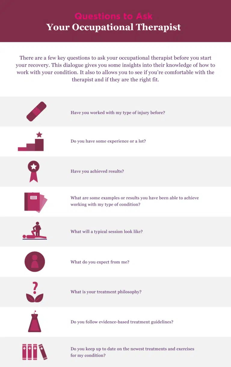There are a few key questions to ask your occupational therapist before you start your recovery. This dialogue gives you some insights into their knowledge of how to work with your condition. It also to allows you to see if you’re comfortable with the therapist and if they are the right fit.
