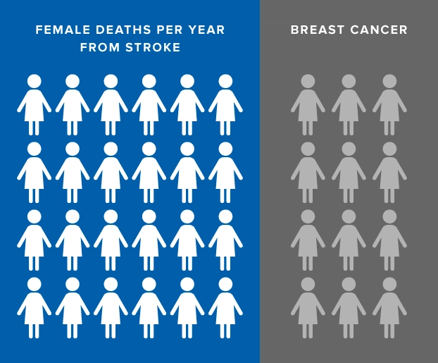 Strokes are prevalent in women. Over 425,000 women suffer from a stroke every year—55,000 more than men. Of that 425,000, over 76,000 women will die from stroke-related complications, twice as many as those who will die from breast cancer.