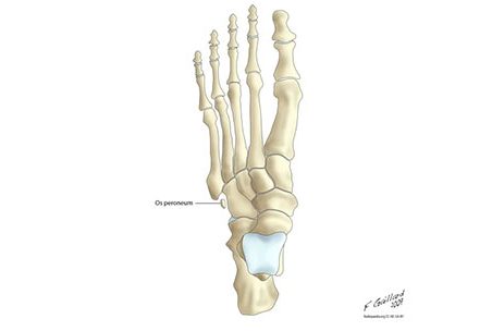 The Os Peroneum is an extra small piece of cartilage or bone that is located in the peroneus longus tendon (the tendon that is located on the outside of the lower leg and ankle). Two sections start together at the upper portion of the lower leg, travel down the lengh of the lower leg and wrap around the ankle bone. Os Peroneum is very common (up to 26% of feet).